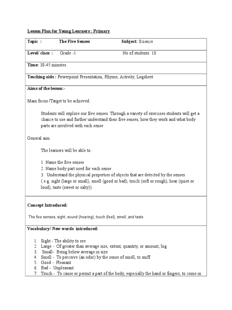5 Senses Grade 1. Learn how your five senses work to give you information about the world around you. The five senses is an educational activity for kids to learn about taste, smell, vision, hearing, and touch.