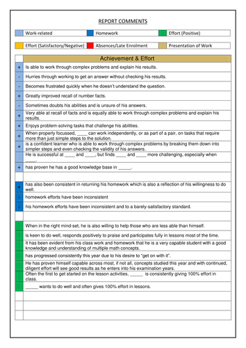 Has an analytic mind for science concepts. I would like to advise all teachers to invest in a book by kimberly colen called a note when i write comments on report cards, i try to think of at least one positive comment. Takes pride in his science. Math report card comments comments you can use to supplement your students' math grade.
