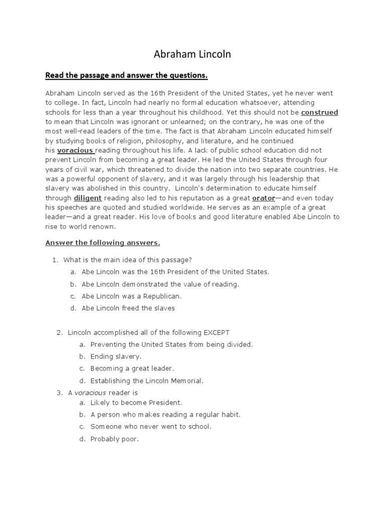 Reading Comprehension Worksheets Abraham Lincoln. The text describes the life, work and assassination of the sixteenth president of the united states, abraham lincoln. Your student will read a short biography of lincoln and summarize it.