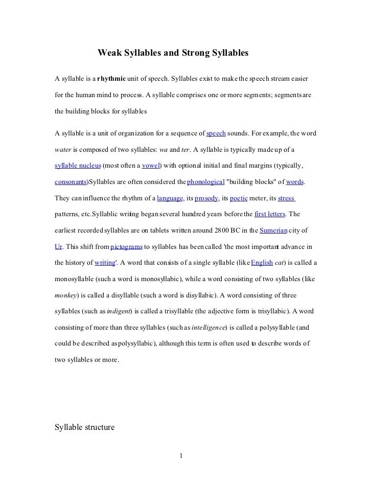 Syllable is also a minimal prosodic unit in which prosodic features of pitch, length and loudness may be realized. It is typically made up of a syllable nucleus (most often a vowel) with optional initial and final margins (typically, consonants). Polysyllables have more than one. The syllable is a basic unit of speech studied on both the phonetic and phonological levels of but when a string of syllables is concerned, how do we decide what is the coda of one and the onset of.